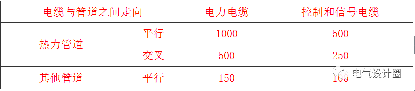 電纜與管道之間無(wú)隔板防護時(shí)的允許距離(mm)8)抑制電氣干擾強度的弱電回路控制和信號電纜,除應符合本規范第3.6.6條~第3.6.9條的規定外,當需要時(shí)可采取下列措施:1. 與電力電纜并行敷設時(shí)相互間距,在可能范圍內宜遠離;對電壓高、電流大的電力電纜間距宜更遠。2. 敷設于配電裝置內的控制和信號電纜,與耦合電容器或電容式電壓互感、避雷器或避雷針接地處的距離,宜在可能范圍內遠離。3. 沿控制和信號電纜可平行敷設屏蔽線(xiàn),也可將電纜敷設于鋼制管或盒中。9) 在隧道、溝、淺槽、豎井、夾層等封閉式電纜通道中,不得布置熱力管道,嚴禁有易燃氣體或易燃液體的管道穿越。10) 爆炸性氣體危險場(chǎng)所敷設電纜,應符合下列規定:1. 在可能范圍應保證電纜距爆炸釋放源較遠,敷設在爆炸危險較小的場(chǎng)所。并應符合下列規定:① 易燃氣體比空氣重時(shí),電纜應埋地或在較高處架空敷設,且對非鎧裝電纜采取穿管或置于托盤(pán)、槽盒中等機械性保護。② 易燃氣體比空氣輕時(shí),電纜應敷設在較低處的管、溝內,溝內非鎧裝電纜應埋砂。2. 電纜在空氣中沿輸送易燃氣體的管道敷設時(shí),應配置在危險程度較低的管道一側,并應符合下列規定:① 易燃氣體比空氣重時(shí),電纜宜配置在管道上方。② 易燃氣體比空氣輕時(shí),電纜宜配置在管道下方。3. 電纜及其管、溝穿過(guò)不同區域之間的墻、板孔洞處,應采用非燃性材料嚴密堵塞。4. 電纜線(xiàn)路中不應有接頭;如采用接頭時(shí),必須具有防爆性。11)用于下列場(chǎng)所、部位的非鎧裝電纜,應采用具有機械強度的管或罩加以保護:1. 非電氣人員經(jīng)?;顒?dòng)場(chǎng)所的地坪以上2m內、地中引出的地坪以下0.3m深電纜區段。2. 可能有載重設備移經(jīng)電纜上面的區段。12) 除架空絕緣型電纜外的非戶(hù)外型電纜,戶(hù)外使用時(shí),宜采取罩、蓋等遮陽(yáng)措施。13) 電纜敷設在有周期性振動(dòng)的場(chǎng)所,應采取下列措施:1. 在支持電纜部位設置由橡膠等彈性材料制成的襯墊。2. 使電纜敷設成波浪狀且留有伸縮節。14)在有行人通過(guò)的地坪、堤壩、橋面、地下商業(yè)設施的路面,以及通行的隧洞中,電纜不得敞露敷設于地坪或樓梯走道上。15)在工廠(chǎng)的風(fēng)道、建筑物的風(fēng)道、煤礦里機械提升的除運輸機通行的斜井通風(fēng)巷道或木支架的豎井井筒中,嚴禁敷設敞露式電纜。16) 1kV以上電源直接接地且配置獨立分開(kāi)的中性線(xiàn)和保護地線(xiàn)構成的系統,采用獨立于相芯線(xiàn)和中性線(xiàn)以外的電纜作保護地線(xiàn)時(shí),同一回路的該兩部分電纜敷設方式,應符合下列規定:1. 在爆炸性氣體環(huán)境中,應敷設在同一路徑的同一結構管、溝或盒中。2. 除上述情況外,宜敷設在同一路徑的同一構筑物中。17)電纜的計算長(cháng)度,應包括實(shí)際路徑長(cháng)度與附加長(cháng)度。附加長(cháng)度,宜計入下列因素:1. 電纜敷設路徑地形等高差變化、伸縮節或迂回備用裕量。2. 35kV及以上電纜蛇形敷設時(shí)的彎曲狀影響增加量。3. 終端或接頭制作所需剝截電纜的預留段、電纜引至設備或裝置所需的長(cháng)度。35kV及以下電纜敷設度量時(shí)的附加長(cháng)度,應符合本規范附錄G的規定。18) 電纜的訂貨長(cháng)度,應符合下列規定:1. 長(cháng)距離的電纜線(xiàn)路,宜采取計算長(cháng)度作為訂貨長(cháng)度。對35kV以上單芯電纜,應按相計算;線(xiàn)路采取交叉互聯(lián)等分段連接方式時(shí),應按段開(kāi)列。2. 對35kV及以下電纜用于非長(cháng)距離時(shí),宜計及整盤(pán)電纜中截取后不能利用其剩余段的因素,按計算長(cháng)度計入5%~10%的裕量,電氣設計在線(xiàn)教學(xué)狄老師;作為同型號規格電纜的訂貨長(cháng)度。3. 水下敷設電纜的每盤(pán)長(cháng)度,不宜小于水下段的敷設長(cháng)度。有困難時(shí),可含有工廠(chǎng)制的軟接頭。